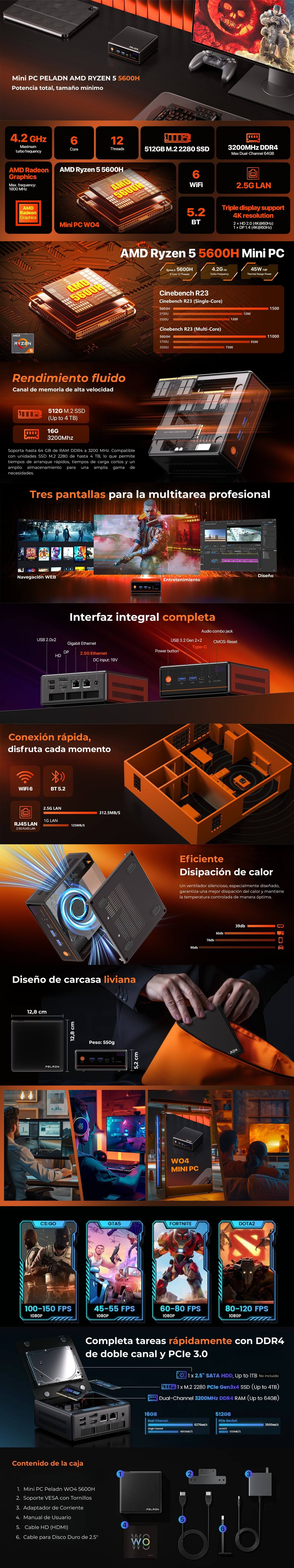 Potencia de escritorio en la palma de tu mano. El Mini computador PELADN WO4 integra el potente procesador AMD Ryzen 5 5600H, ofreciendo un rendimiento excepcional para multitarea, trabajo de oficina y entretenimiento 4K. Rápido, silencioso y ultra compacto, es la solución perfecta para optimizar tu espacio sin sacrificar velocidad.