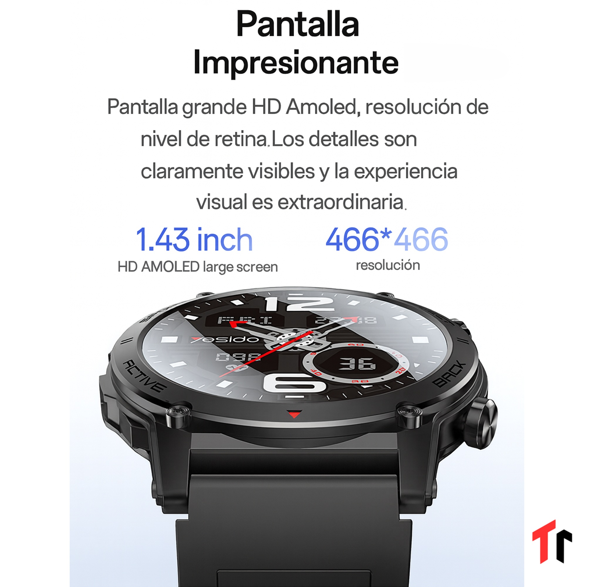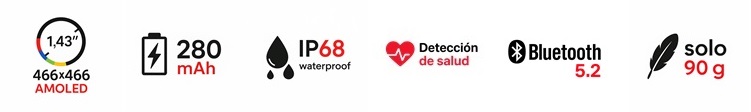 Pantalla HD de 1.43” Amoled con resolución de 466×466 píxeles, que ofrece colores vibrantes y una visualización nítida desde cualquier ángulo.